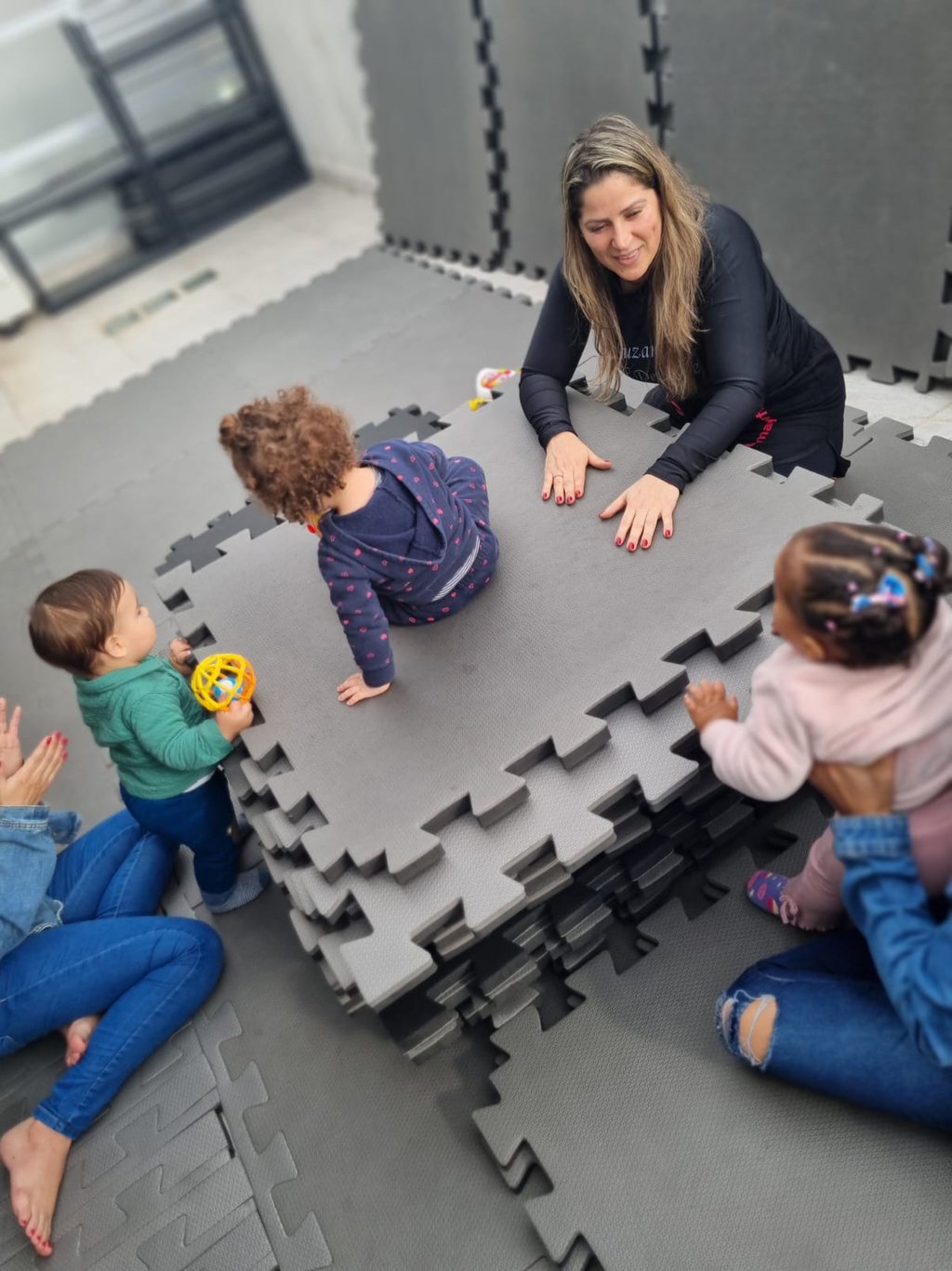 Movimento, contato e segurança. Uma atividade lúdica que estimula a coordenação motora, o vínculo com o adulto e a consciência corporal desde cedo.